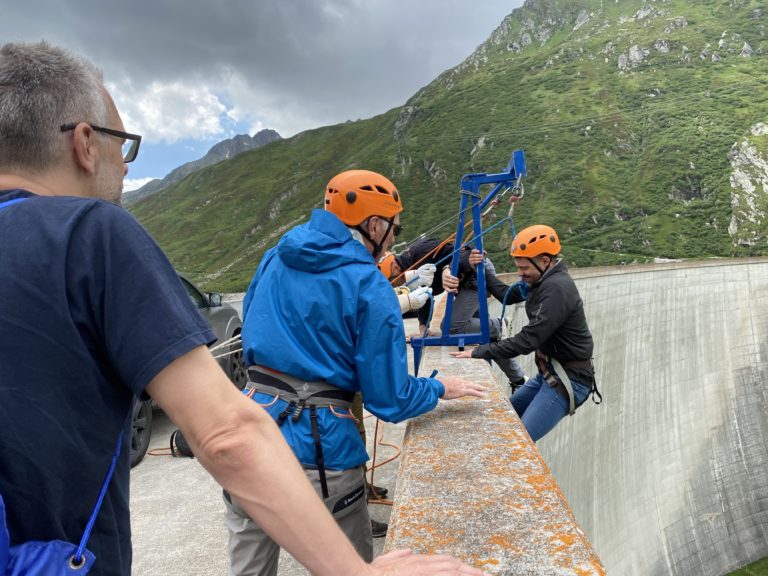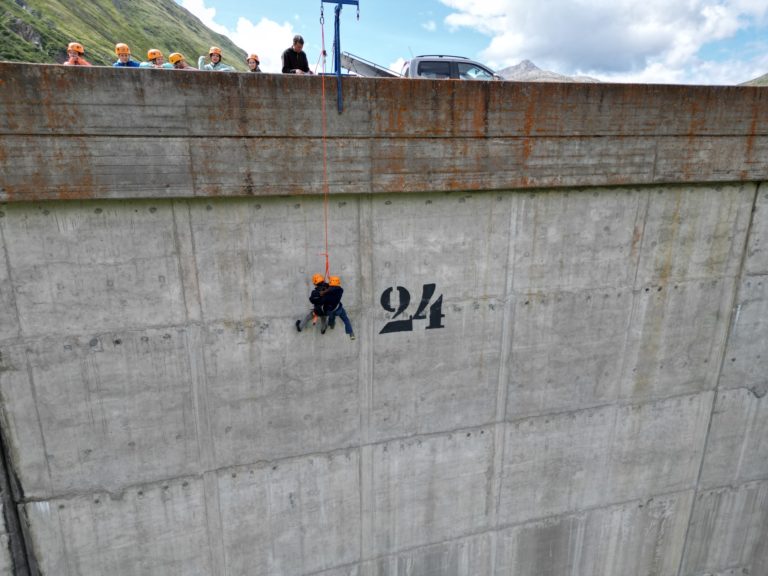Hast Du Lust auf eine gruppentaugliche Mutprobe? Die fast senkrechte 100 Meter hohe Staumauer fasziniert mit ihrem Anblick. Nun steigt das Adrenalin wenn wir über die Mauerkrone steigen und uns der Wand entlang abseilen.